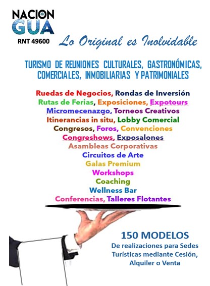 Bienvenido(a) a Nación Gua. Para nosotros será un honor servir a su reconocida excelencia como Gestor Cultural y/o Empresario Turístico. Somos un Buró (RNT 49600), creador, productor y concesionario de marcas originales del Turismo M.I.C.E : Meetings, Incentives, Conventions, Exhibitions. Manejamos Congresos, Convenciones, Foros, Exposiciones, Galas, Coaching, Talleres, Cursos Digitales, Circuitos de Turismo Cultural y Reuniones similares. Ocasionalmente, también, eventos del género escénico, como Covers de realizaciones del género anteriormente enunciado. Cumplimos con todos las exigencias legales de funcionamiento en el mercado como OPC (OPERADORES PROFESIONAES DE CONGRESOS , FERIAS Y CONVENCIONES). No como Agencias de Viajes, por tratarse de otro tipo de turismo y registro. Exija siempre por seguridad que un ofertante de estos servicios, cuente con el RNT de OPC.